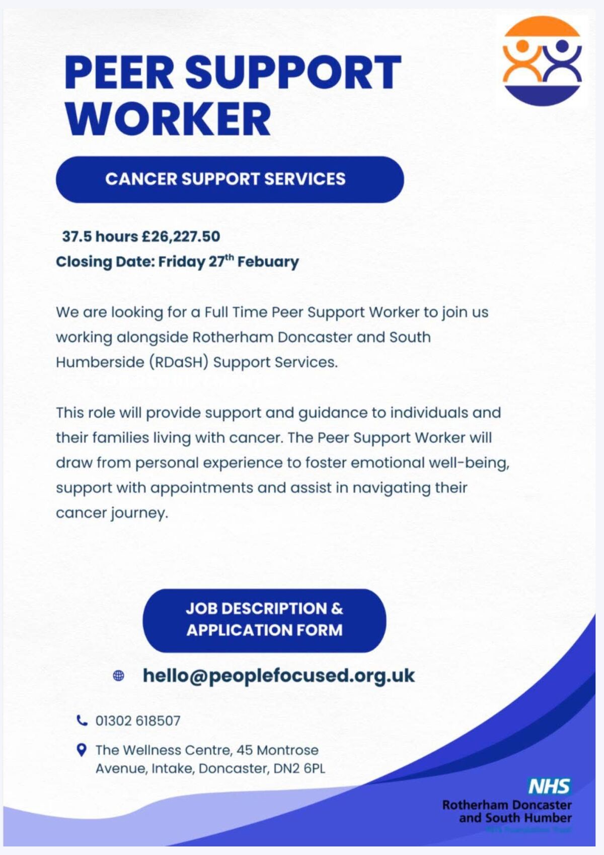 We are excited to announce a full-time employment opportunity for a Peer Support Worker with our partners at RDaSH in their Cancer Services! If you have lived experience and a passion for making a difference in the lives of others, we want to hear from you!